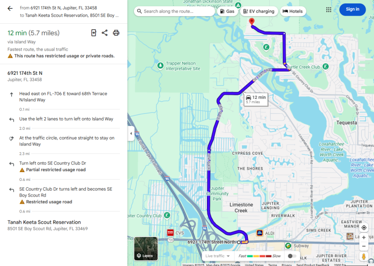 From the FL Turnpike, take exit 116 and head east on W. Indiantown Road. Use the left 2 lanes to turn left onto Island Way. Continue straight at the round-a-bout. Turn left onto SE Country Club Drive. Follow all the way to the end, take a left onto SE Boy Scout Road. The Tanah Keeta Scout Reservation welcome sign will be visible from the road.